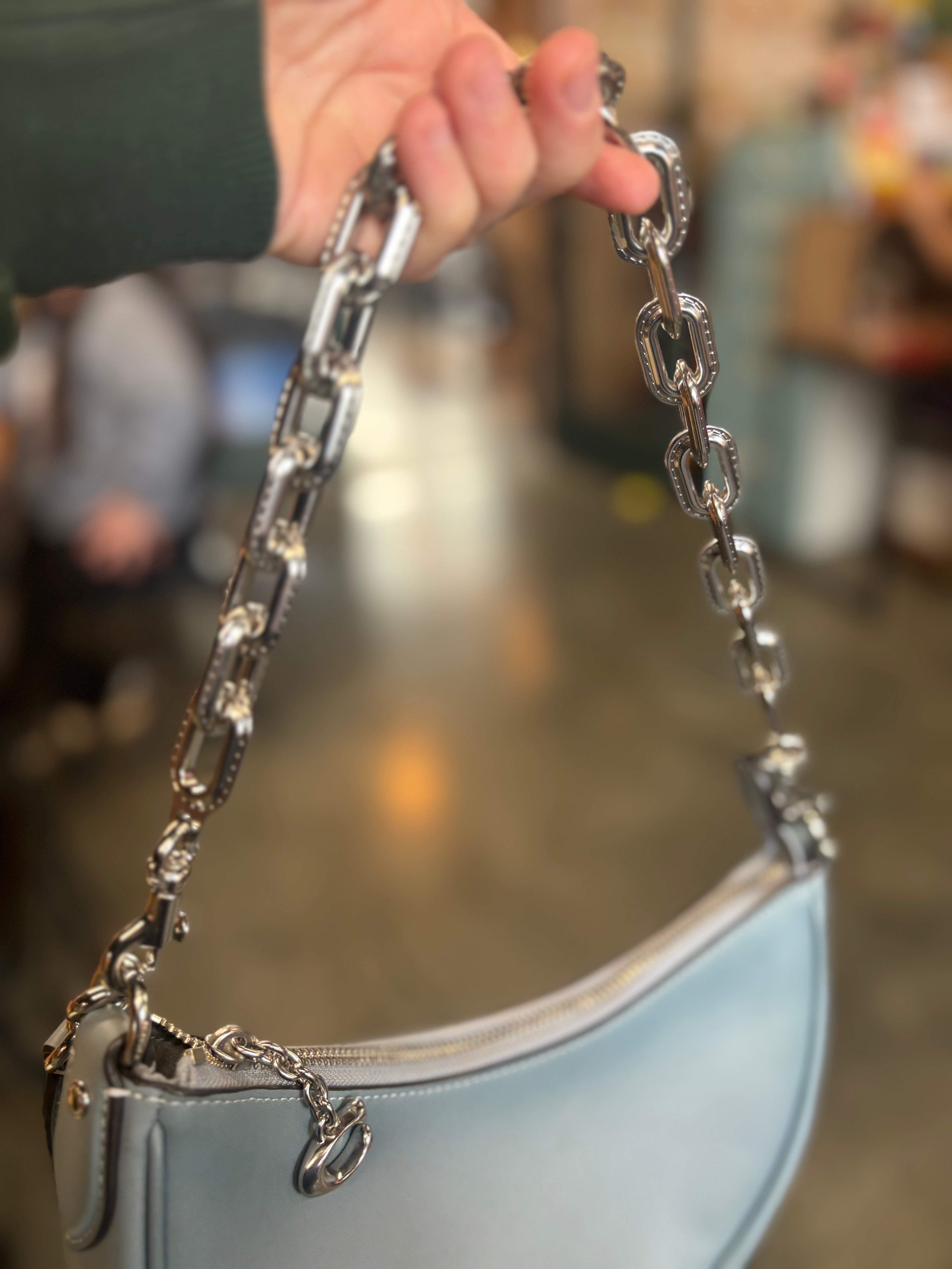 - Strap: Chunky silver chain shoulder strap + slim leather strap