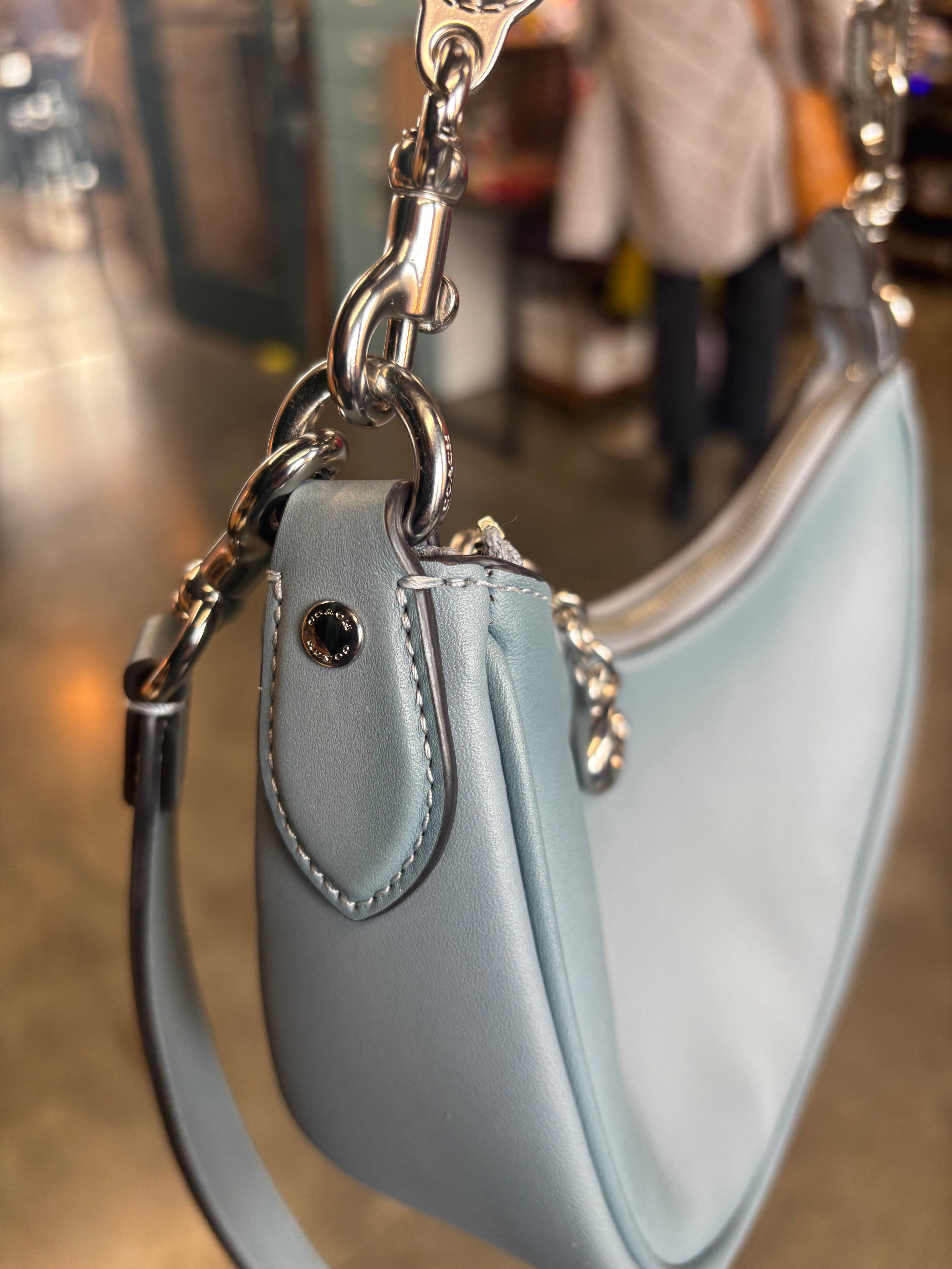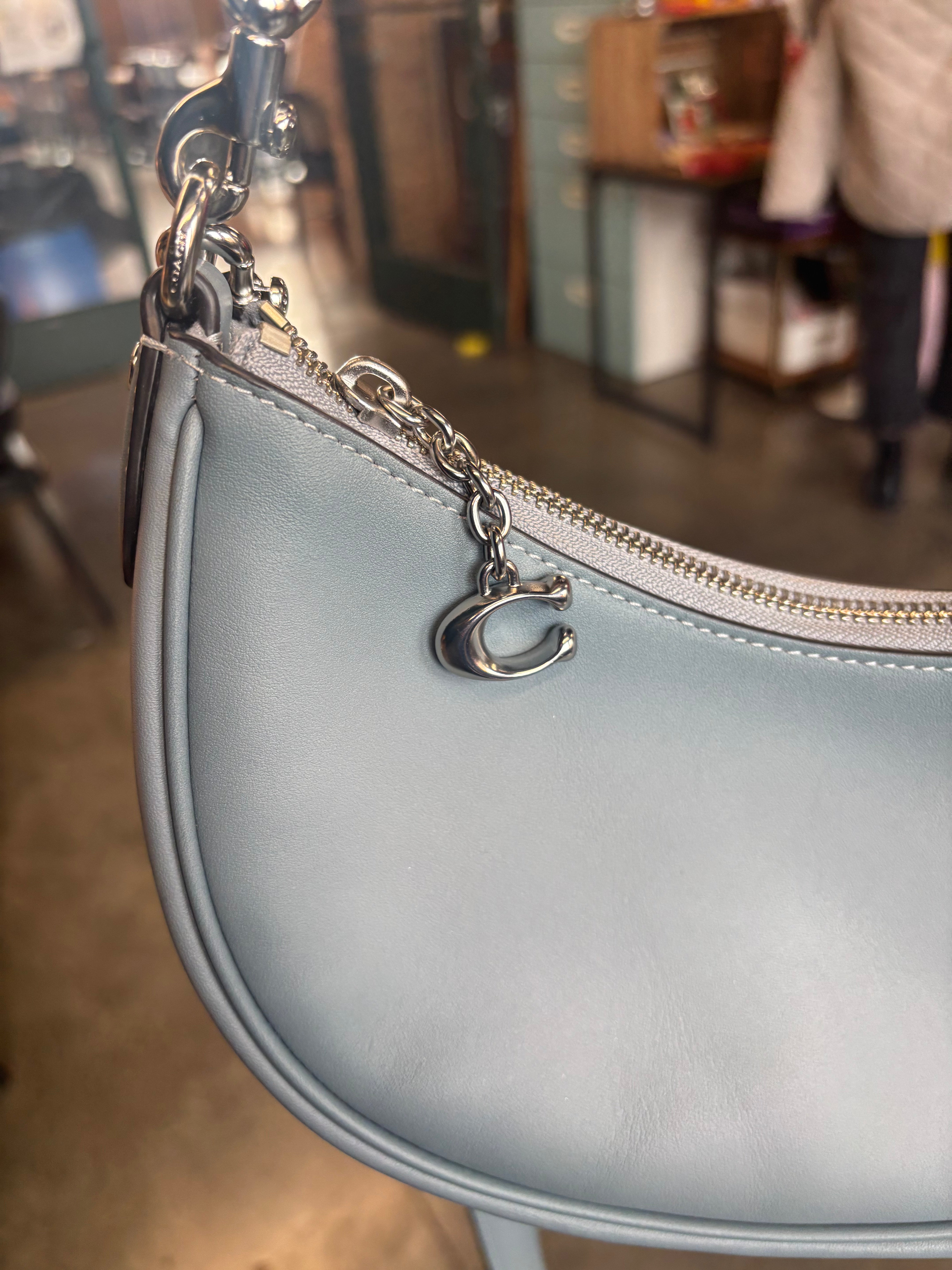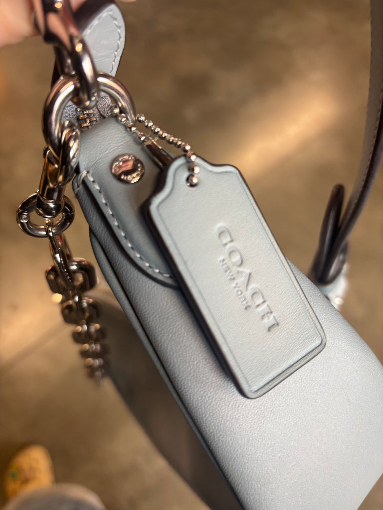 Step into effortless cool-girl style with this Coach Luna Shoulder Bag in a dreamy light blue glovetanned leather. The edgy silver chain strap, half-moon silhouette, and premium leather make this bag both modern and collectible — a perfect everyday Y2K-inspired piece.