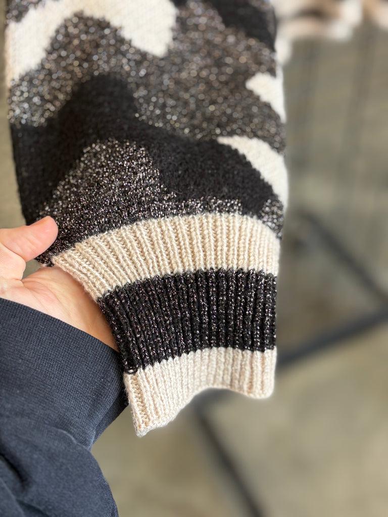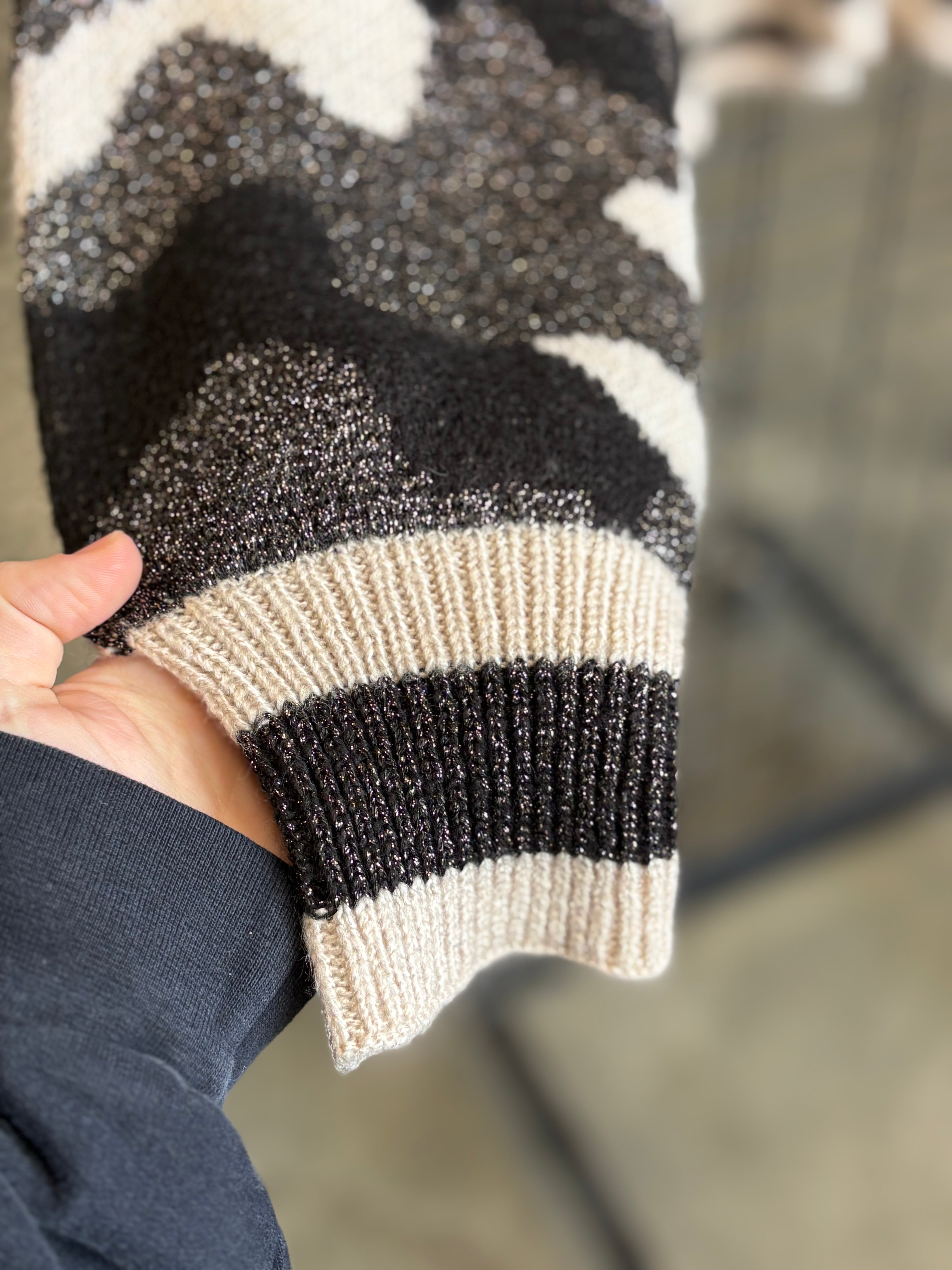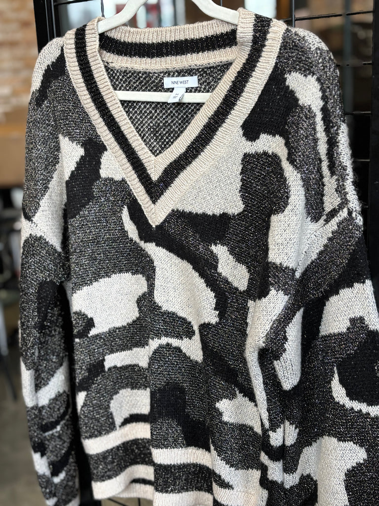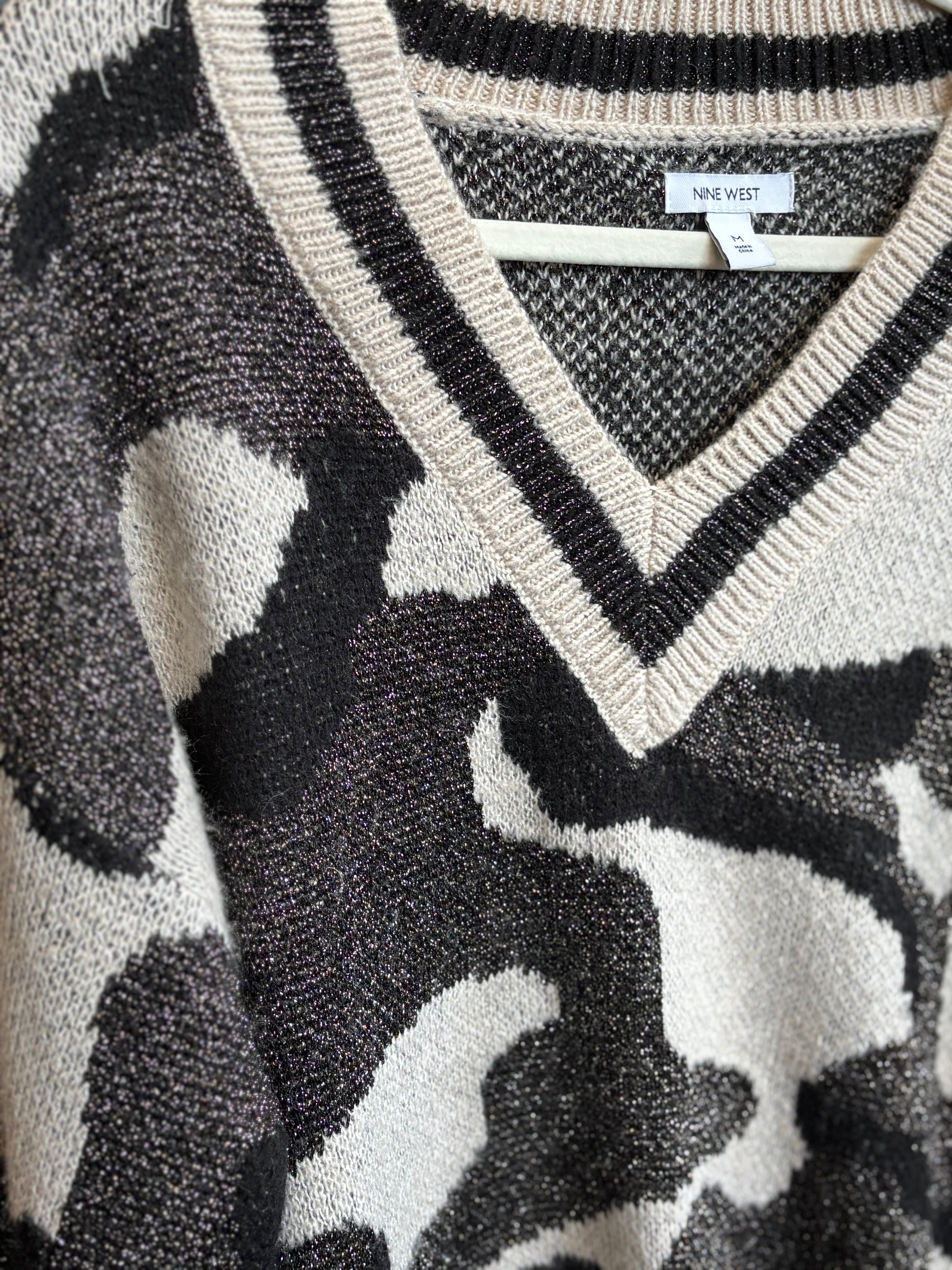 Vintage Y2K Nine West metallic knit sweater featuring a bold black, cream, and silver camo-inspired pattern. The soft lurex thread gives it a subtle shimmer that catches the light perfectly. Deep V-neckline and ribbed trim details add structure while keeping it comfy and relaxed. This piece is the perfect mix of cozy and cool — total early-2000s glam.